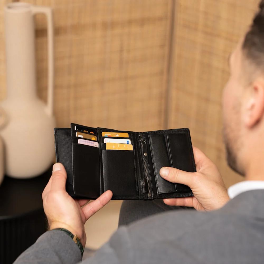 Il comporte une poche intérieure pour la monnaie, 2 poches pour les billets, 8 poches pour les cartes et plusieurs autres compartiments de rangement.