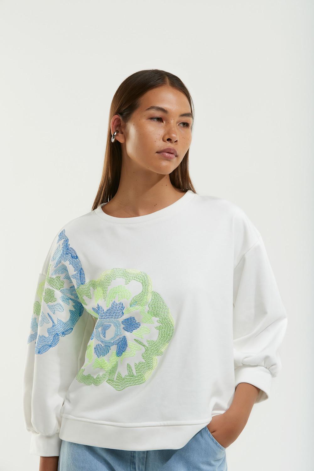 Imprimé floral vert clair et bleu sur le devant et les manches