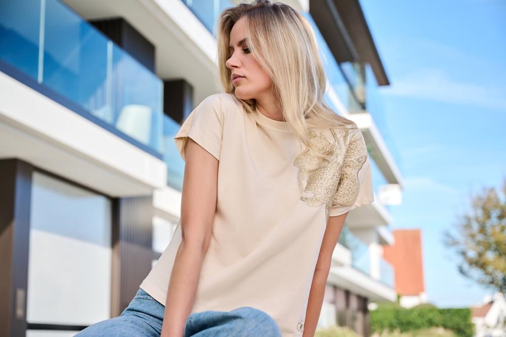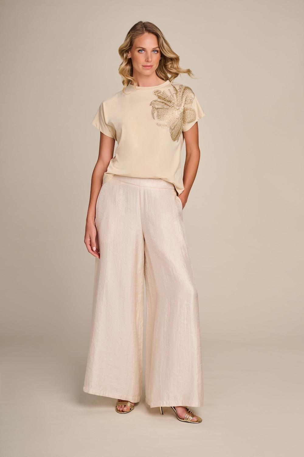 Bloemapplicatie met kralen en strass-stenen op voor- en achterzijde, subtiel logo