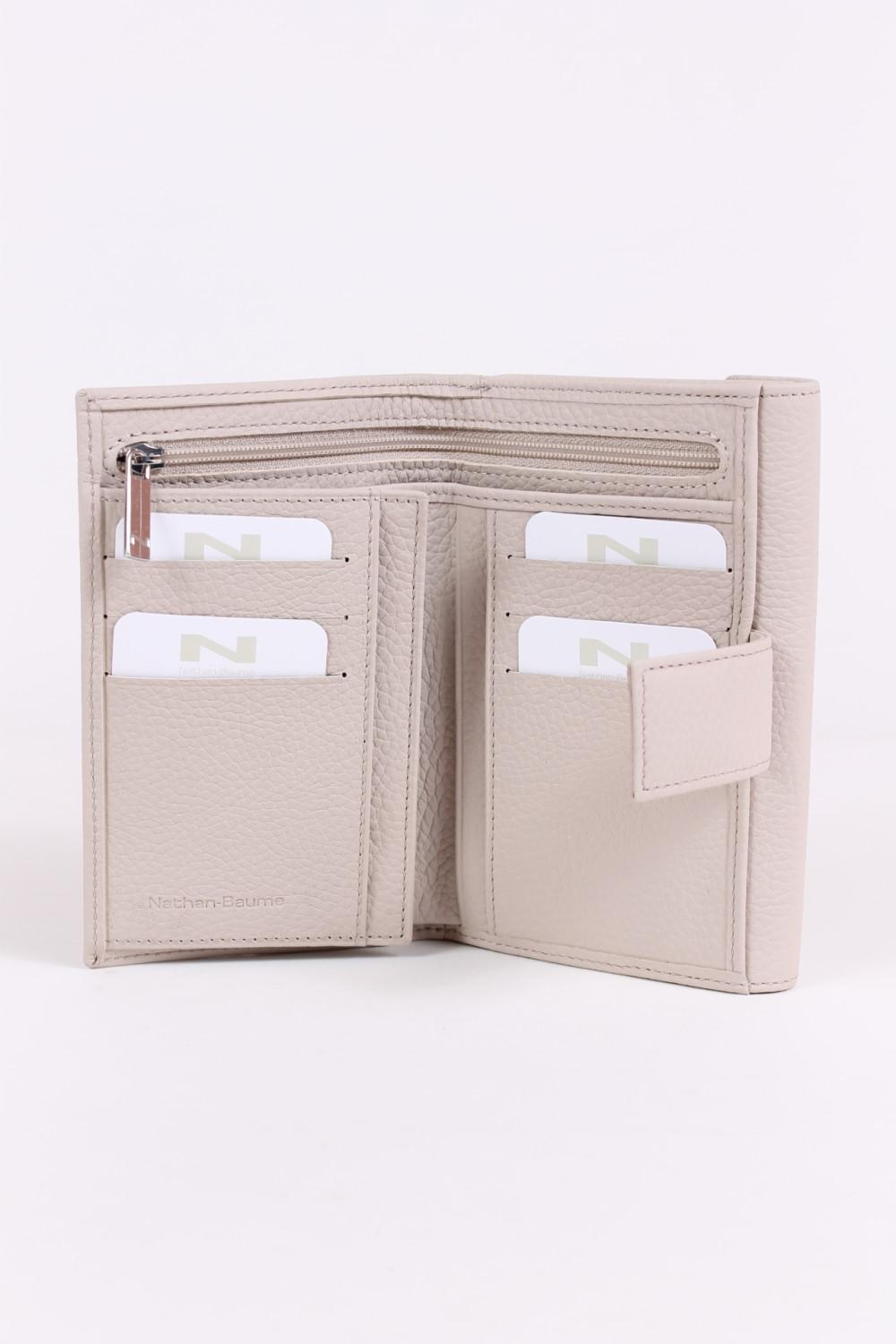 Zeer praktische damesportefeuille van het Belgische Nathan-Baume, langs 1 zijde zijn er 9 vakken voor kaarten, een groot doorzichtig venster, een uitschuifbaar flapje voor rijbewijs en 2 vakken voor biljetten waarvan 1 met een rits.