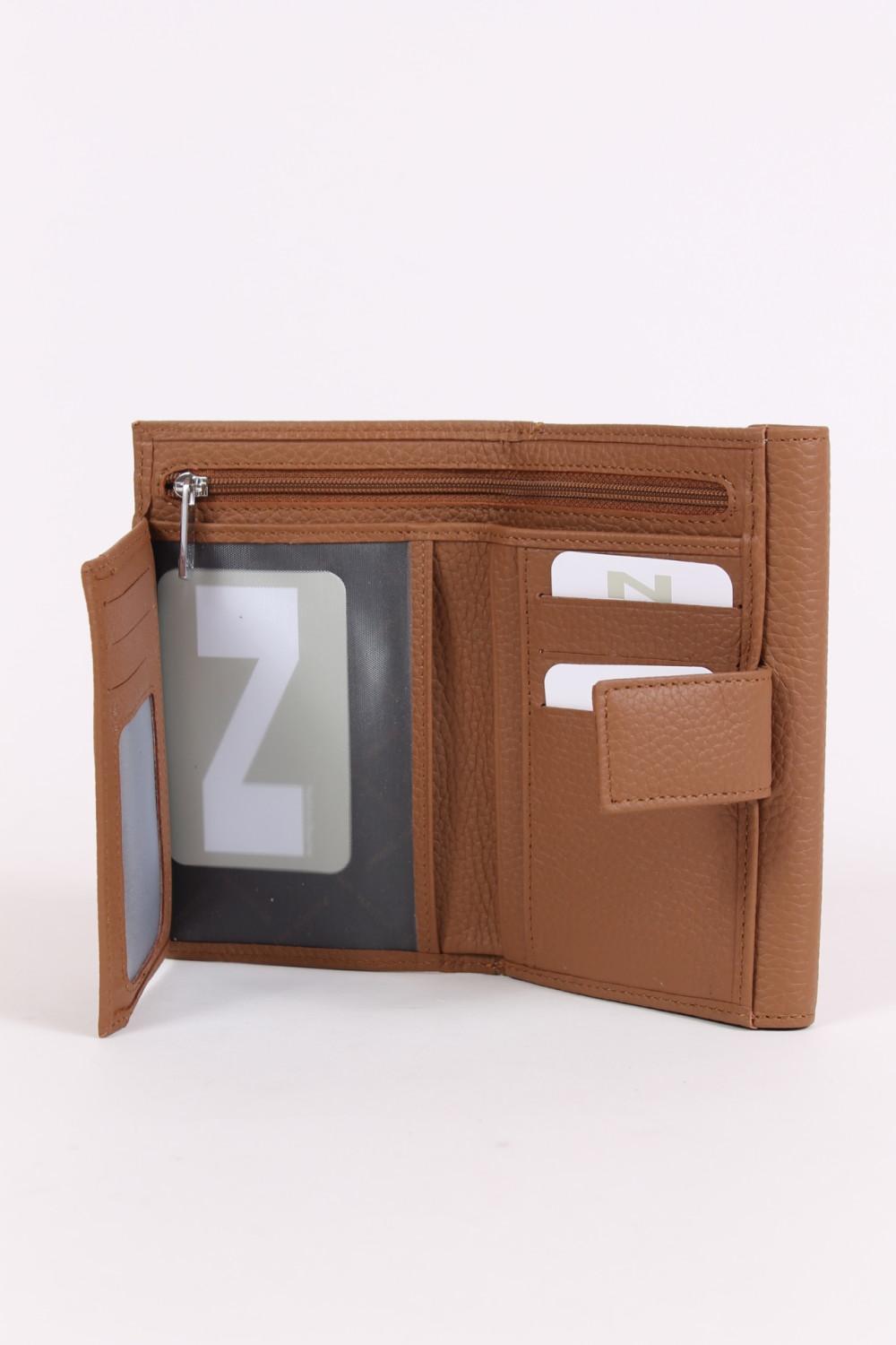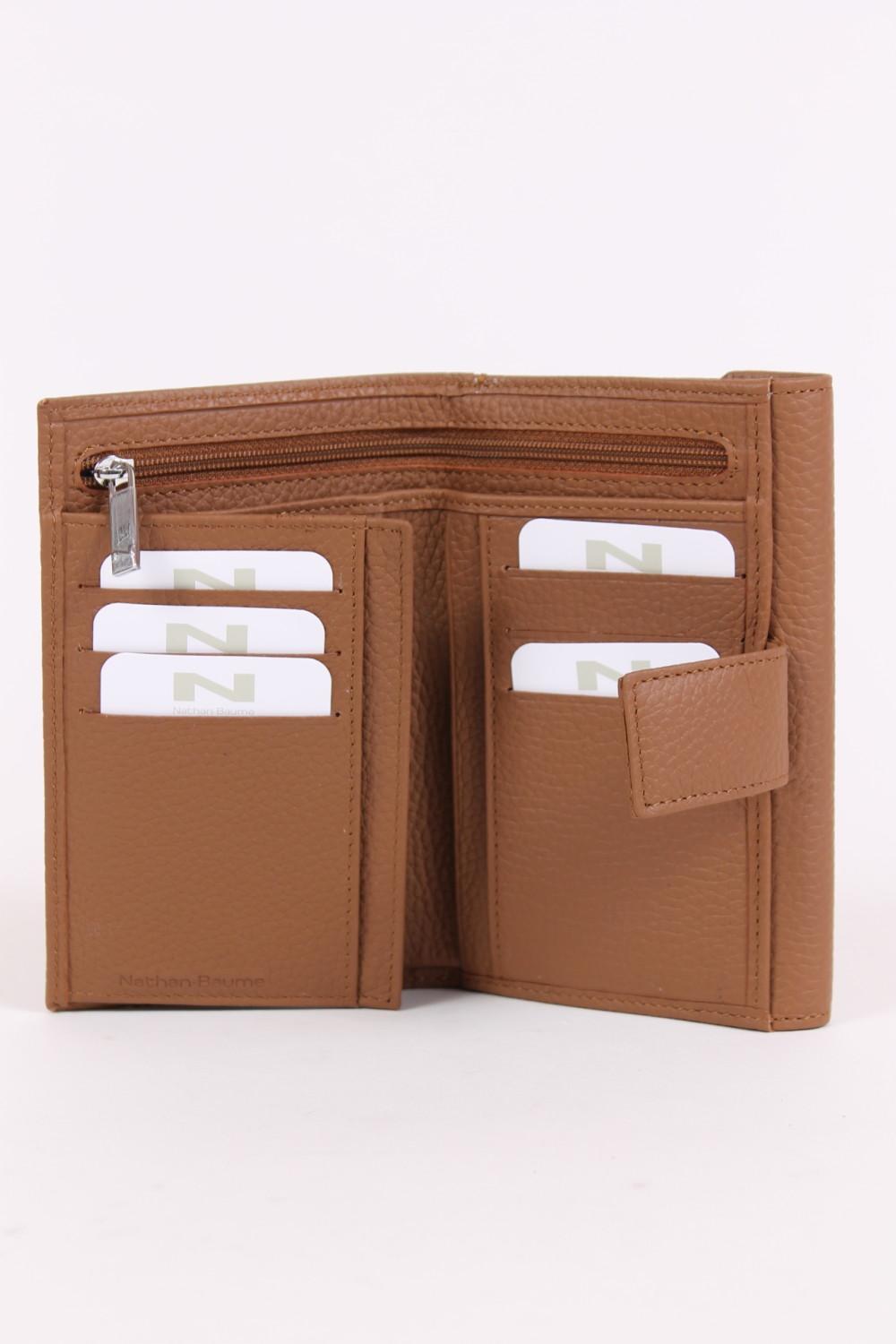 Zeer praktische damesportefeuille van het Belgische Nathan-Baume, langs 1 zijde zijn er 9 vakken voor kaarten, een groot doorzichtig venster, een uitschuifbaar flapje voor rijbewijs en 2 vakken voor biljetten waarvan 1 met een rits.